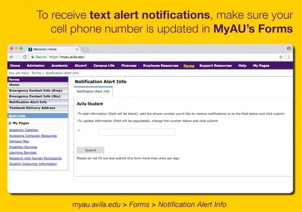 Avila University uses Regroup as our mass notification/text alert system, so please be sure your cellphone number is updated as that information is uploaded to our secured notification software. To update your cellphone number, log-in to MyAU, at the header row click on [Forms], then in the left column click on [Notification Info]. Input your phone number, click [Submit], and the next time Avila University puts out a notice about an emergency on campus or a school closing due to weather, you will get a message.